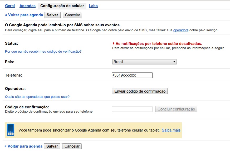 Em “Configurações do Celular” você cadastra o celular que irá receber a notificação.